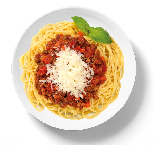 Špagety vložíme do slané vařící vody a vaříme na zkus. Hovězí přední krk a vepřový bok očistíme, pomeleme na hrubé šajbě, okořeníme solí, pepřem a zprudka opečeme na tuku v pánvi.Měkké maso vyjmeme a na výpek vložíme na kostičky nakrájenou mrkev, celer a petržel. Vše pomalu restujeme dozlatova, přidáme cibuli na půlkolečka a dále restujeme do ztmavnutí s občasným podléváním vody, přidáme cukr, drcená rajčata, podlejem vínem a dochutíme bylinkami. Vložíme zpět maso. Zahustíme a provaříme.