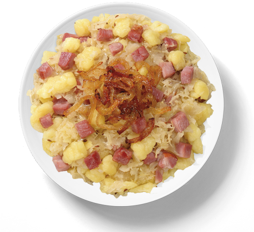 Halušky si připravíme z vařených nastrouhaných brambor, mouky, soli a vejce. Maso nakrájíme na kostičky. Cibuli orestujeme do zlatova na sádle, přidáme maso, zelí, okořeníme a vše orestujeme. Vložíme halušky a vše smícháme.