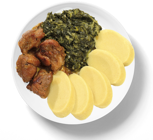 Cibuli orestujeme na tuku dozlatova, přidáme špenát, podlijeme vodou, provaříme, dochutíme solí, pepřem a česnekem, zahustíme a dochutíme. Vepřové maso (plec, bůček) nakrájíme na kostky, osolíme, opepřím, přidáme kmín a vložíme na plech. Cibuli nakrájíme na půl kolečka, česnek utřeme se solí a společně s masem promícháme. Maso lehce podlijeme vodou, přikryjeme pokličkou a dáme do konvektomatu (trouby) na pečení s parou 78°C cca 10hod. Poté pokličku odklopíme, maso promícháme a dáme péct na 15min při 200° .