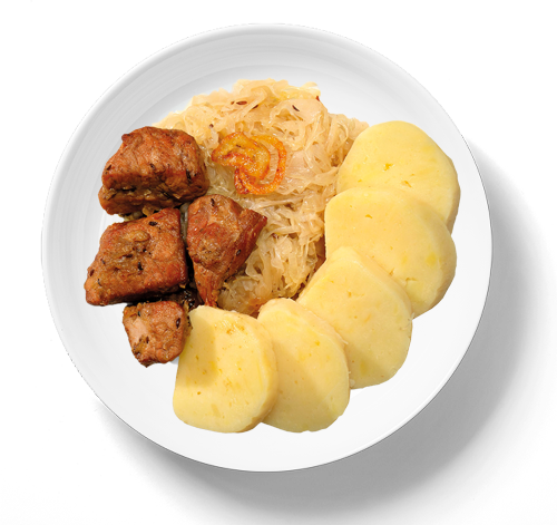Zelí zalijeme vodou, osolíme a přidme mletý kmín. Měkké dochutíme cukrem, zahustíme, provaříme a nakonec vlejeme rozpuštěnou slaninu.Vepřové maso (plec, bůček) nakrájíme na kostky, osolíme, opepřím, přidáme kmín a vložíme na plech. Cibuli nakrájíme na půl kolečka, česnek utřeme se solí a společně s masem promícháme. Maso lehce podlijeme vodou, přikryjeme pokličkou a dáme do konvektomatu (trouby) na pečení s parou 78°C cca 10hod. Poté pokličku odklopíme, maso promícháme a dáme péct na 15min při 200°C .
