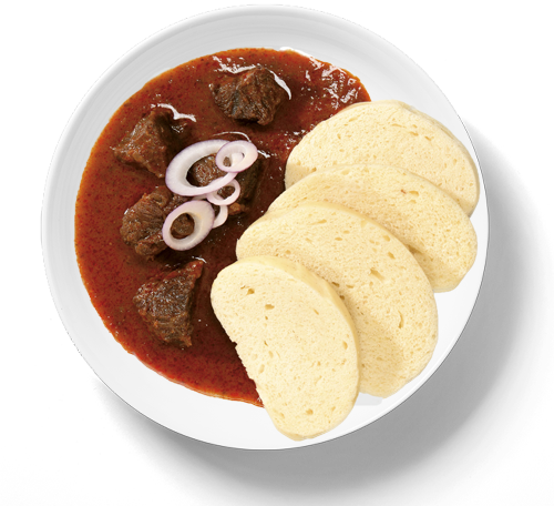 Cibuli nakrájíme na drobno, vložíme do pánve na tuk a orestujeme s občasným podlíváním vývarem úplně do tmava (cca 1hod). Hovězí maso (krk), osolíme, opepříme, potřeme utřeným česnekem se solí, přidáme kmín a dáme na cibuli. Maso lehce orestujeme, až pustí šťávu, přidáme mletou papriku,protlak, orestujeme, podlijeme vývarem, přikryjeme pokličkou a pomalu dusíme s občasným doléváním vývaru cca 4hod.