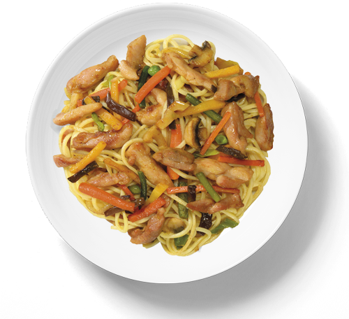 Nudle uvaříme v osolené vodě. Očištěné kuřecí stehenní řízky nakrájíme na nudličky, osolíme, opepříme a zprudka opečeme na tuku. Přidáme na nudličky nakrájenou cibuli, mrkev, sójové klíčky, čínská houba, čerstvá paprika, pórek, bambus.výhonky, kari koření, mleté chilli, mletý zázvor, vše orestujeme, lehce polijeme vodou z nudlí a nakonec přidáme pikantní sladkou chilli omáčku.m tuku